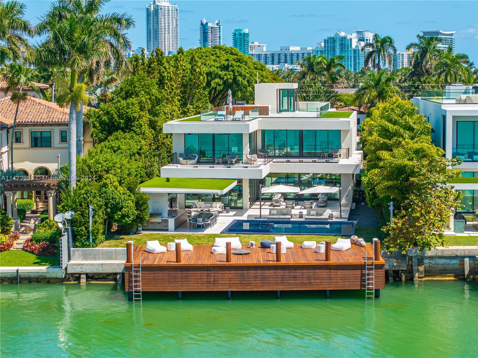 Extravagant modern mansion on prestigious North Bay Road where explosive sunsets over Miami’s splendid skyline are a backdrop from everywhere! Experience the finest waterfront living from this 15,547-SF property featuring 75 feet of premier waterfrontage with oversized dock & panoramic views! Inside the 7-bed 7bath+2, smart home, open floor-plan living areas have wall-to-wall glass doors that completely open, creating sensational indoor-outdoor entertaining ambience. The gated property is abundant with luxe amenities: wet bar, state-of-the-art theater, elevator, Savant control system, gourmet kitchen, wine cellar, interior fishpond with stingrays, gym, rooftop, cabana, tiled saltwater pool with spa. Built in 2022, this spectacular mansion is equipped with a + 4-car garage & generator!
